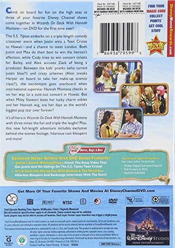 Details: Climb on board for fun on the high seas as three of your favorite Disney Channel shows come together in WIZARDS ON DECK WITH HANNAH MONTANA -- on DVD for the first time ever! The S.S. TIPTON embarks on a triple-length comedy crossover event when Justin wins a Teen Cruise to Hawaii -- and a chance to meet London. Both Justin and Max do their best to win the heiress's affection, while Cody tries to win concert tickets for Bailey, and Alex accuses Zack of being a prankster. Between the kids' pranks (who turned Justin blue?!) and crazy schemes (Alex sneaks Harper on board to take her make-up science class?!), the excitement goes overboard when international superstar Hannah Montana checks in on her way to a sold-out concert in Hawaii. But when Miley Stewart loses her lucky charm anklet and her Hannah wig, are her days as the world's biggest pop star over forever? It's all here in WIZARDS ON DECK WITH HANNAH MONTANA with three times the fun and triple the laughs! Plus, this new full-length adventure includes exclusive behind-the-scenes footage, hilarious cast bloopers and more!