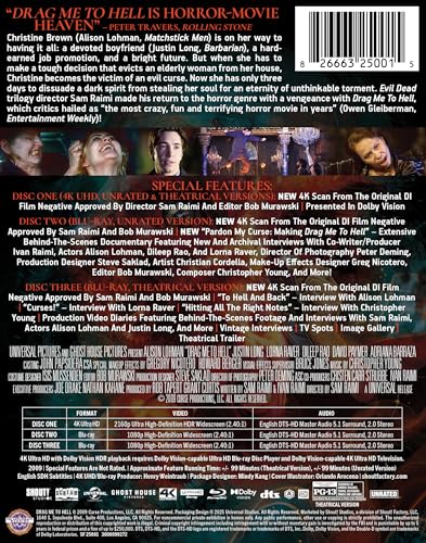 Details: Product Description Christine Brown (Alison Lohman, Big Fish, Beowulf) is on her way to having it all: a devoted boyfriend (Justin Long, Barbarian, Jeepers Creepers), a hard-earned job promotion, and a bright future. But when she has to make a tough decision that evicts an elderly woman from her house, Christine becomes the victim of an evil curse. Now she has only three days to dissuade a dark spirit from stealing her soul before she is dragged to hell for an eternity of unthinkable torment. Director Sam Raimi (The Evil Dead Trilogy, Darkman) returns to the horror genre with a vengeance in the film that critics rave is "the most crazy, fun and terrifying horror movie in years" (Owen Gleiberman, Entertainment Weekly)! Bonus Content: 4K Scan from the Original DI Film Negative Approved by Director Sam Raimi and Editor Bob Murawski Presented in Dolby Vision Pardon My Curse: Making Drag Me to Hell—Extensive Behind-the-Scenes Documentary Featuring New and Archival Interviews with Co-Writer/Producer Ivan Raimi, Actors Alison Lohman, Dileep Rao and Lorna Raver, Director Of Photography Peter Deming, Production De To Hell and Back: Interview with Actress Alison Lohman Curses: Interview with Actress Lorna Raver Hitting All the Right Notes: Interview with Composer Christopher Young Production Video Diaries Featuring Interviews with Director Sam Raimi and Actors Alison Lohman and Justin Long Theatrical Trailer ]]> Special Features 4K Scan from the Original DI Film Negative Approved by Director Sam Raimi and Editor Bob Murawski Presented in Dolby Vision Pardon My Curse: Making Drag Me to Hell—Extensive Behind-the-Scenes Documentary Featuring New and Archival Interviews with Co-Writer/Producer Ivan Raimi, Actors Alison Lohman, Dileep Rao and Lorna Raver, Director Of Photography Peter Deming, Production De To Hell and Back: Interview with Actress Alison Lohman Curses: Interview with Actress Lorna Raver Hitting All the Right Notes: Interview with Composer Christopher Young Production Video Diaries Featuring Interviews with Director Sam Raimi and Actors Alison Lohman and Justin Long Theatrical Trailer ]]>