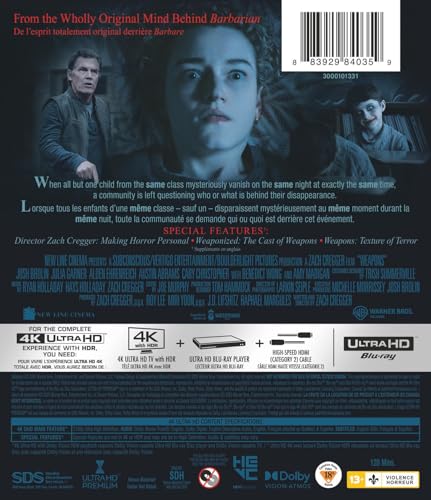 Details: Product Description From New Line Cinema and Zach Cregger, the wholly original mind behind Barbarian, comes a new horror/thriller: Weapons. When all but one child from the same class mysteriously vanish on the same night at exactly the same time, a community is left questioning who or what is behind their disappearance. Bonus Content: Director Zach Cregger: Making Horror Personal Weaponized: The Cast of Weapons Weapons: Texture of Terror ]]> Special Features Director Zach Cregger: Making Horror Personal Weaponized: The Cast of Weapons Weapons: Texture of Terror ]]>