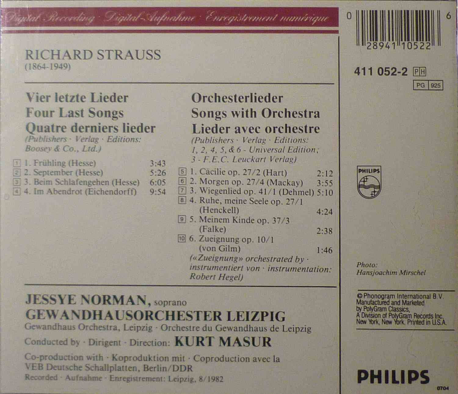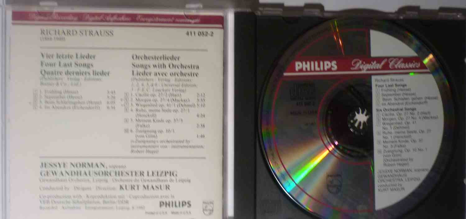Details: Amazon.ca Lovers of the Four Last Songs have come to take good recordings of the set for granted. Jessye Norman's early digital account with Kurt Masur and the Leipzigers is one of the best--powerful, sensuous, and very well recorded. Strauss may have conceived the songs with an ideal voice in mind, but he made a point of asking that Kirsten Flagstad give the first performance of the set. Since then, no comparably endowed soprano, in possession of both the tonal richness and the extraordinary amplitude that were Flagstad's, has recorded the Four Last Songs, save for Norman. The tessitura of the cycle is perfect for her--not too high, with almost every phrase lying in the warm, lustrous middle part of the voice--and Norman shapes the words with consummate skill and sensitivity. To hear her soar out over the orchestra, carrying the most demanding phrases with long-breathed splendor, is to enjoy, for a moment, the return of a golden age. --Ted Libbey