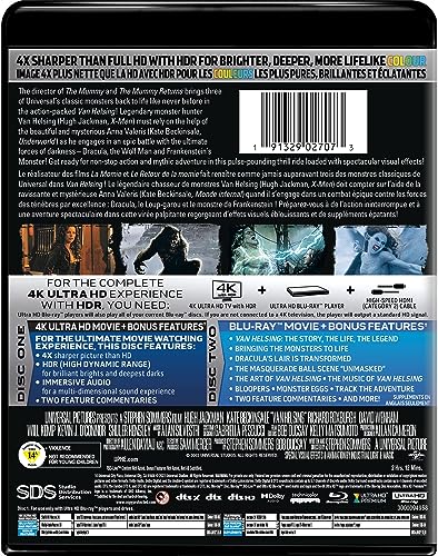 Details: The director of The Mummy and The Mummy Returns brings three of Universal's classic monsters back to life like never before in the action-packed Van Helsing! Legendary monster hunter Van Helsing (Hugh Jackman, X-Men) must rely on the help of the beautiful and mysterious Anna Valeris (Kate Beckinsale, Underworld) as he engages in an epic battle with the ultimate forces of darkness—Dracula, the Wolf Man and Frankenstein's Mosnster! Get ready for non-stop action and mythic adventure in this pulse-pounding thrill ride loaded with spectacular visual effects! Bonus Content: Features High Dynamic Range (HDR10) for Brighter, Deeper, More Lifelike Color Feature Commentary with Director Stephen Sommers and Editor/Producer Bob Ducsay Feature Commentary with Richard Roxburgh, Shuler Henley and Will Kemp Van Helsing: The Story, The Life, The Legend Track the Adventure Bringing the Monsters to Life You Are in the Movie! The Music of Van Helsing Bloopers Dracula's Lair Is Transformed The Masquerade Ball Scene "Unmasked" The Art of Van Helsing Monster Eggs ]]>