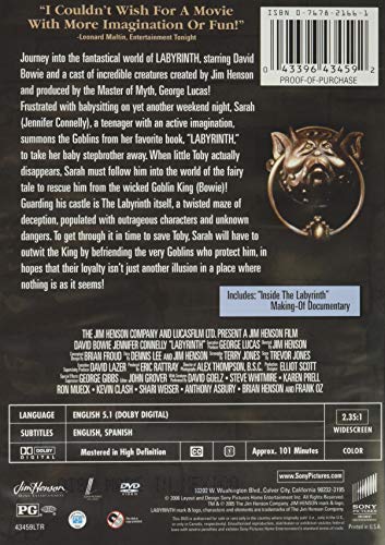 Details: Relive the magic. This newly restored, 2-disc anniversary edition of Jim Henson's Labyrinth contains an all-new commentary and bonus features that are guaranteed to captivate as never before. David Bowie and Jennifer Connelly invite you into a magical universe where nothing is what it seems. Babysitting infant stepbrother Toby on a weekend night isn't young Sarah's (Connelly) idea of fun. Frustrated by his crying, she secretly imagines the Goblins from her favorite book, Labyrinth, carrying Toby away. When her fantasy comes true, a distraught Sarah must enter a maze of illusion to bring Toby back from a kingdom inhabited by mystical creatures and governed by the wicked Goblin King (Bowie).