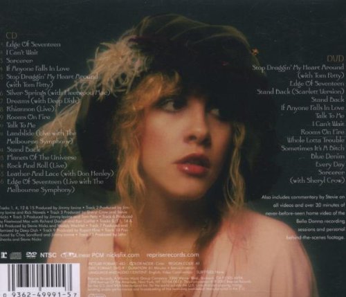 Details: Amazon.ca With a career that's seen her soar from struggling journeywoman to superstar via a fateful invitation to join Fleetwoood Mac, the singer who now bills herself as the most successful female artist in rock history looks back on the various facets of her iconography with this 16-track career retrospective and its accompanying DVD. The mystic-folkie ethos that has long been her caricature are well showcased via the cult fave Rumours outtake/B-side "Silver Spring," the muscular Sheryl Crow collaboration "Sorcerer," and a live version of the moody "Rhiannon" that casts it in even longer shadows. Yet Stevie Nicks has always displayed a willingness to push herself beyond her hippie muse, as witnessed by the dense aura of Deep Dish's remix of Mac's "Dreams" and such disparate, pop-savvy solo highlights as "I Can't Wait," "Stand Back," and shrewd, successful duets with Tom Petty ("Stop Draggin' My Heart Around") and Don Henley ("Leather and Lace"). Indeed, bookended by the original version of the hit "Edge of Seventeen" and a live revamping with the Melbourne Symphony that amps its every melodramatic nuance, reinvention often seems the anthology's subtext. The included DVD compiles 13 of Nicks's evocative videos with new commentary by her, as well as an insightful, previously unreleased home video shot during the Bella Donna sessions. --Jerry McCulley Product description Brand New