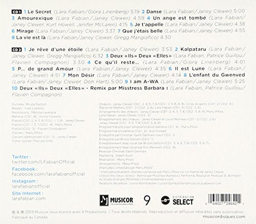 Details: Le nouvel album de Lara Fabian, ce sont 17 titres inédits, comme autant d’histoires, qui s’enchainent sans jamais s’emmêler, qui s’assemblent doucement sans se ressembler, mais qui composent une seule et même personnalité. Une personnalité complexe et riche, que nous dévoile ici Lara Fabian, sans fard, avec toute la force dont elle sait faire preuve, à la fois pudique et mise à nu. Conçu et enregistré entre Canada et Belgique, Le secret marque le retour de Lara Fabian aux sources de son identité la plus intime, tout en refusant d’emprunter le chemin balisé sur lequel on pourrait parfois l’attendre. Mais toujours en accord avec elle-même.