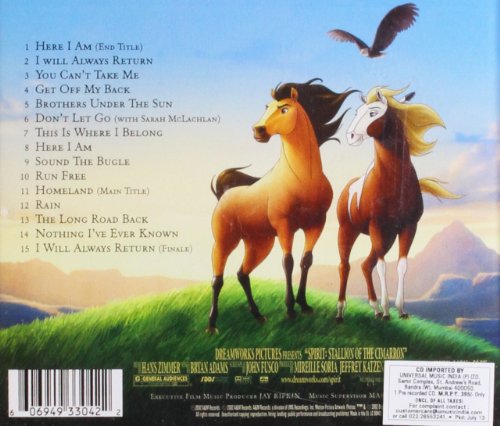 Details: Amazon.ca After a two-year gap, Bryan Adams chose the animated movie Spirit: Stallion of the Cimarron to make his triumphant return. The soundtrack is by no means a solo effort, but he has cowritten and sings on eight brand-new songs. Two of them are deemed so good they appear twice. The first of these, "Here I Am", is an uplifting tune that plays as the film's end credits. The other is the film's finale, "I Will Always Return", which seems like a statement on the artists' career. Of the others, the most interesting is the duet with Sarah McLachlan on "Don't Let Go", lending it a particularly atmospheric air with their combined breathy vocal stylings. This being a story of a mystical heroic horse, the lyrics are consistently upbeat and optimistic. Behind those lyrics is a collection of composers providing the melodies. Leading the team is Hans Zimmer, who's now an old hand at the animated genre (cf The Lion King and The Prince of Egypt). Towards the end of the album are four cues totalling 20 minutes of his instrumental score. These are perfectly in keeping with both the songs and Zimmer's style, featuring big orchestral themes overlaid with electronic augmentation. All together it's an hour of exactly what both artists do best. --Paul Tonks