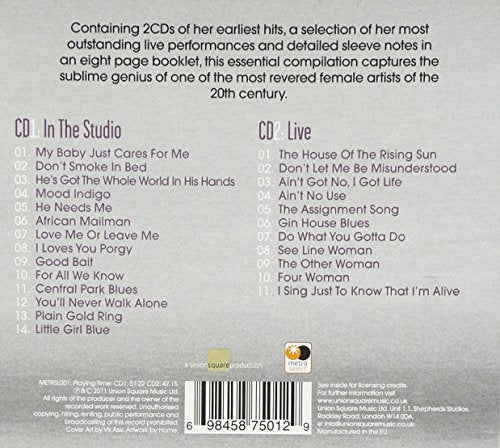 Details: UK two CD collection containing some of the Jazz great's earliest hits, and a selection of her most outstanding live performances. This essential compilation captures the sublime genius of one of the most revered female artists of the 20th century. On this compilation, Nina utilizes touches of Jazz, Classical and gospel music. She sings tin-pan alley songs and torch songs. There are songs taken from musicals and there are songs hewn from Blues. She performs two self-composed instrumentals - 'African Mailman' and 'Central Park Blues' - and she breaks your heart on 'Little Girl Blue'. She also sings a song called 'My Baby Just Cares For Me', a light ditty which would later become her musical albatross. Metro Select.