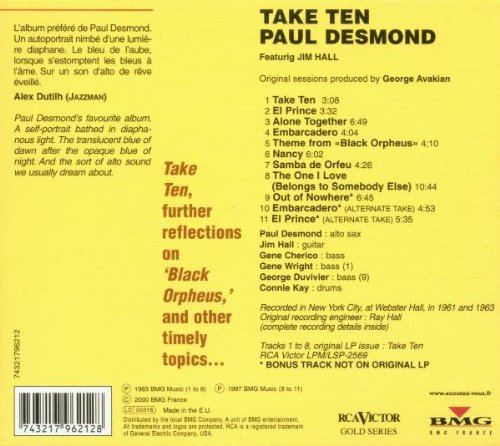 Details: Amazon.ca Il y a toujours eu un "malentendu Paul Desmond". Voici en effet un saxophoniste qui joua longtemps dans l'ombre de la formation de Dave Brubeck, lui-même pianiste controversé (à tort). Or ce Take Ten de 1963 nous prouve, à l'instar de Easy Living ou de Bossa Antigua, qu'il possédait un jeu merveilleux, à rapprocher de celui de Stan Getz ou de Phil Woods. Les thèmes ("Take Ten", "Embarcadero", "Samba de Orfeu"…) sont magnifiques, et ses partenaires (Jim Hall ou Connie Kay en particulier) sont exemplaires. --Eric Frank