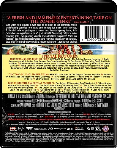 Details: Just when you thought it was safe to go back to the cemetery, those brain-eating zombies are back and hungry for more tasty mortals. A fiendish mix of outrageous humor and heart-stopping terror, this "veritable smorgasbord of fun" (L.A. Herald Examiner) delivers skin-crawling jolts, eye-popping visuals and relentless surprises! When an accident at a medical supply warehouse reanimates an army of corpses, they arise from their graves with a ravenous hunger…for human brains! Bonus Content: 2022 4K Scan of the Original Camera Negative In Dolby Vision (HDR 10 Compatible) Audio Commentary with Gary Smart (Co-author of the Complete History of The Return of the Living Dead) and Chris Griffiths Audio Commentary with Actors Thom Mathews, John Philbin and Make-up Effects Artist Tony Gardner Audio Commentary with Director Dan O'Bannon and Production Designer William Stout Audio Commentary with the Cast and Crew Featuring Production Designer William Stout and Actors Don Calfa, Linnea Quigley, Beverly Randolph, and Allan Trautman Zombie Subtitles In Their Own Words—The Zombies Speak The Decade of Darkness—Featurette On '80s Horror Films Theatrical Trailers TV Spots Still Gallery—Posters, Lobby Cards, Movie Stills and Behind-the-Scenes Photos Still Gallery—Behind-the-Scenes Photos from Special Make-up Effects Artist Kenny Myers' Personal Collection The Return of the Living Dead Workprint—Includes 20 minutes of Additional Footage (In Standard Definition) More Brains: A Return to the Living Dead—The Definitive Documentary on The Return of the Living Dead The FX of the Return Living Dead—With Production Designer William Stout, FX Make-up Artists William Munns, Tony Gardner, Kenny Myers and Craig Caton-Largnet, Visual Effects Artists Bret Mixon and Gene Warren Jr. (Expanded Version) Party Time: The Music of The Return of the Living Dead—with Music Consultants Budd Carr and Steve Pross and Soundtrack Artists Plus Musicians (Expanded Version) The Origins of The Living Dead—An Interview with John A. Russo The Return of the Living Dead: The Dead Have Risen—Interviews with Cast Members Clu Gulager, James Karen, Don Calfa, Thom Mathews, Beverly Randolph, and Linnea Quigley Designing The Dead—Interviews with Writer/Director Dan O'Bannon and Production Designer William Stout Horror's Hallowed Grounds—Revisiting the Locations of The Film A Conversation with Dan O'Bannon—His Final Interview ]]>