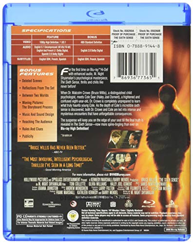 Details: Blu-ray(TM) Hi-Def and enhanced audio bring new chilling suspense to acclaimed filmmaker M. Night Shyamalan's THE SIXTH SENSE, one of the greatest psychological thrillers of all time! When Dr. Malcolm Crowe (Hollywood superstar Bruce Willis), a distinguished child psychologist, meets Cole Sear (Haley Joel Osment), a frightened and confused eight-year-old, Dr. Crow is completely unprepared to learn what truly haunts young Cole. As the depth of Cole's incredible sixth sense is discovered, both Dr. Crowe and Cole are led into intense and mysterious encounters that will have unforgettable consequences. The suspense will keep you on the edge of your seat until the final truth is revealed in THE SIXTH SENSE -- now more spine-tingling than ever on Blu-ray High Definition!