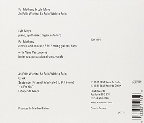 Details: Amazon.ca Guitarist Pat Metheny and his long-time keyboard collaborator/alter ego Lyle Mays saw in their rural American roots a mystical connection to an entire world of sounds, and with As Falls Wichita, So Falls Wichita Falls, they began the process of fashioning an idiomatic folk expression all their own. With the help of master percussionist Nana Vasconcelos, they create a whistlestop tour of musical outposts on the extended title track that is at once Gothic and atmospheric in the manner of Weather Report, bucolic and harmonious like the Byrds, with echoes of small-towns, strip malls and lonely railyards, over expanses of wide-open space that reflect their familial origins and countless miles wandering the interstate on a string of college-town one-nighters. In the four square major modes of "Ozark" and "It's for You" you can hear the beige tinge of the American experience that melded with African-American music to give this nation it's musical depth and breadth, while "September Fifteenth" is a prayerful, ruminative reflection on the spirit of their romantic forebear, pianist Bill Evans. --Chip Stern Product description Brand New