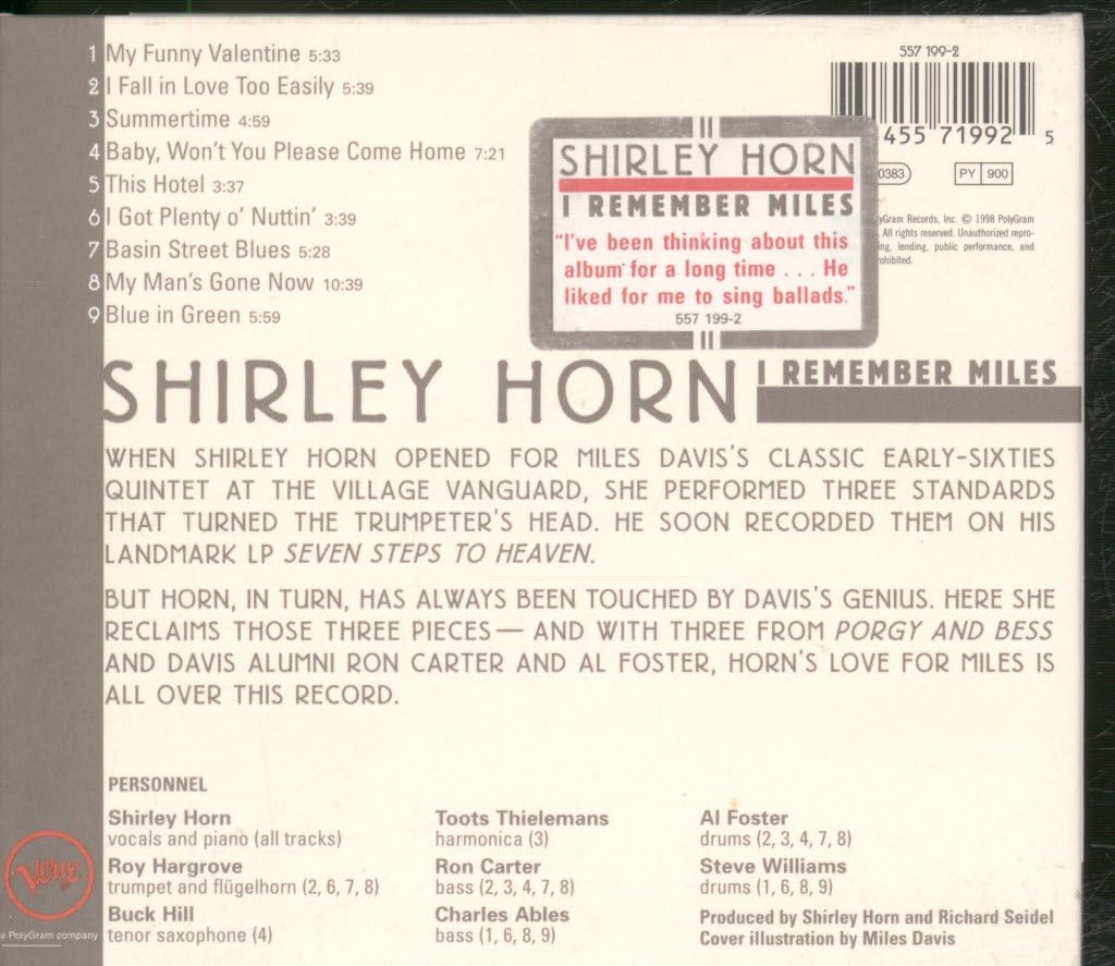 Details: Review Full of real warmth and obvious admiration, singer-pianist Horn's latest album is more informed than the usual tribute.... The nine songs on this album were all associated with the trumpeter, and Horn even used Davis's longtime bassist Ron Carter and his drummer Al Foster to supplement her own rhythm section. But she is clearly the star of this project. -- People Amazon.ca Shirley Horn is a talented jazz vocalist/pianist who has been recording since the early 1960s. Her delicate voice was an inspiration to Miles Davis, who performed three standards on his disc, Seven Steps to Heaven after hearing Horn's evocative interpretations. On I Remember Miles, Horn pays tribute to the late trumpeter by singing those standards ("Basin Street Blues," "Baby Won't You Please Come Home," and "I Fall in Love Too Easily") and reprising a trio of tunes from Porgy And Bess. Accompanied by trumpeter Roy Hargrove and harmonica virtuoso Toots Thielemans as well as Davis alumni Ron Carter on bass and Al Foster on drums, Ms. Horn displays all the nuance and style that endeared Miles to her in the first place. A moving homage. --Mitch Myers