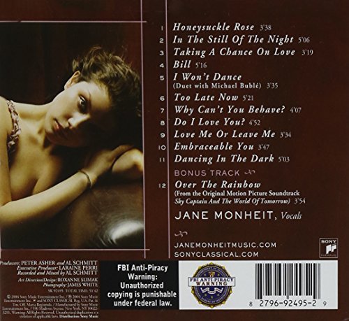 Details: Amazon.ca On her fourth album, Taking A Chance On Love, singer Jane Monheit makes her leap to the majors and the fit is a good one. As she's proven on past efforts, Monheit is a traditional stylist who expertly mines American standards by balancing pop's accessible sensibility and jazz's rich complexity. The material could be, and has been, in worse hands than Monheit's--her exceptional technique again brings these songs to life without taking liberties with structure, melody or odd arrangements. It's her exceptional execution, tonal palette, and phrasing that gives these songs a sense of artistry. She also gets subtle support from an impressive cast of sidemen (including guest singer Michael Buble, bassists Ron Carter and Christian McBride, and guitarist Romero Lubambo) in a variety of contexts, ranging from jazz combos to orchestra to vocal-and-single-instrument duets. Highlights include the tender "Embraceable You," the lushly orchestrated "Dancing in Dark" and the jaunty bebop version of "Honeysuckle Rose." -Tad Hendrickson Product Description Jane Monheit