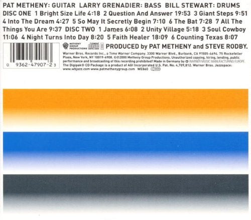 Details: Amazon.ca Pat Metheny's brought a string of trios to bear on his music, none of them lasting as a touring band long enough to bring a session like Trio Live to life. As on Trio 99-00, Metheny's bandstand has Larry Grenadier and Bill Stewart beside him, and they burn from start to finish. Taking up 13 tunes, Metheny shows off every nuance of his talents. Stewart invokes Elvin Jones, with a lead-footed focus on tempo and a hammering power. Grenadier provides calm force, keeping time with steely firmness. Metheny is all over the map, laying back to open the session, throwing off torrents of modulated guitar synth on a 19-minute "Question and Answer" and then diving laconically into one of jazz's least laconic pieces, John Coltrane's "Giant Steps." He's granite thick on the rocking "Faith Healer" and gently harplike on "Into the Dream," grooving steadily in between. All the while, the audience is hyped and involved. The trio has chemistry like Keith Jarrett's standards project, with each member providing texture and finishing each other's musical thoughts telepathically. This you can hear on familiar tunes, as well as on 35 minutes of new material rounding out the second disc. --Andrew Bartlett