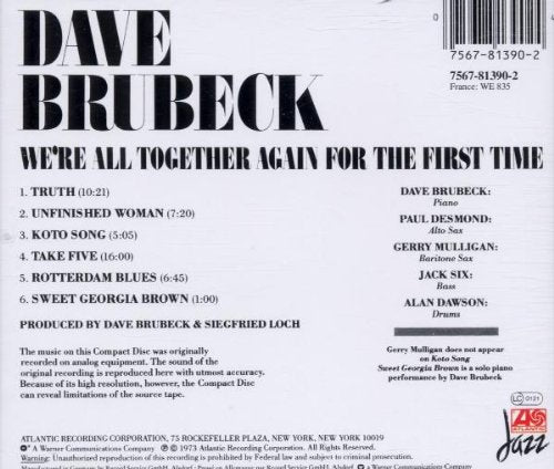 Details: We're All Together Again For The First Time is a 1973 live album by Dave Brubeck and his quintet recorded at various locations in Europe. The album peaked at 20 on the Billboard Top Jazz Charts. "Truth", "Unfinished Woman" and "Take Five" were recorded at the Berliner Philharmonie, "Koto Song" was recorded at the Paris Olympia and "Rotterdam Blues" and "Sweet Georgia Brown" at the De Doelen concert hall in Rotterdam.