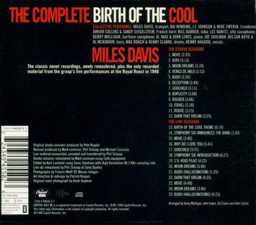 Details: Amazon.ca Birth of the Cool is the first important leader date from Miles Davis, one of jazz's most seminal figures and farsighted practitioners. Having made his reputation in large measure from playing with bop giant Charlie Parker, Davis confounded expectations when he embraced the "cool" arranging style of Gil Evans, an arranger for Claude Thornhill's band. Evans, who was employing unique voicings by adding French horns and tuba to Thornhill's instrumentations, also emphasized a diminished use of vibrato in both reeds and brass, producing a drier, "cool" sound. Two of Evans's arrangements, "Boplicity" and "Moon Dreams," appear on the album. Also involved are baritone saxophonist Gerry Mulligan, who contributed such outstanding tunes as "Jeru" and "Venus de Milo," and Modern Jazz Quartet pianist John Lewis. The result is a date that has withstood the tests of time, fashion, and Davis's own extraordinary growth as a performer. An enhanced set, The Complete Birth of the Cool expands the original issue with previously bootlegged live recordings of Davis's nonet at the Royal Roost in New York in 1948. Although the sound quality is far from perfect, the performances are remarkable, and worth the additional expense for the serious fan. --Fred Goodman Product Description Miles Davis "The Complete Birth of the Cool". Is the classic nonet recordings, newly remastered, plus the only recorded material from the groups live performances at the Royal Roost in 1948. This CD is Divied into two groups the Studio Sessions and the Live Sessions a total of 25 tracks this CD is a must have for any Miles fan.