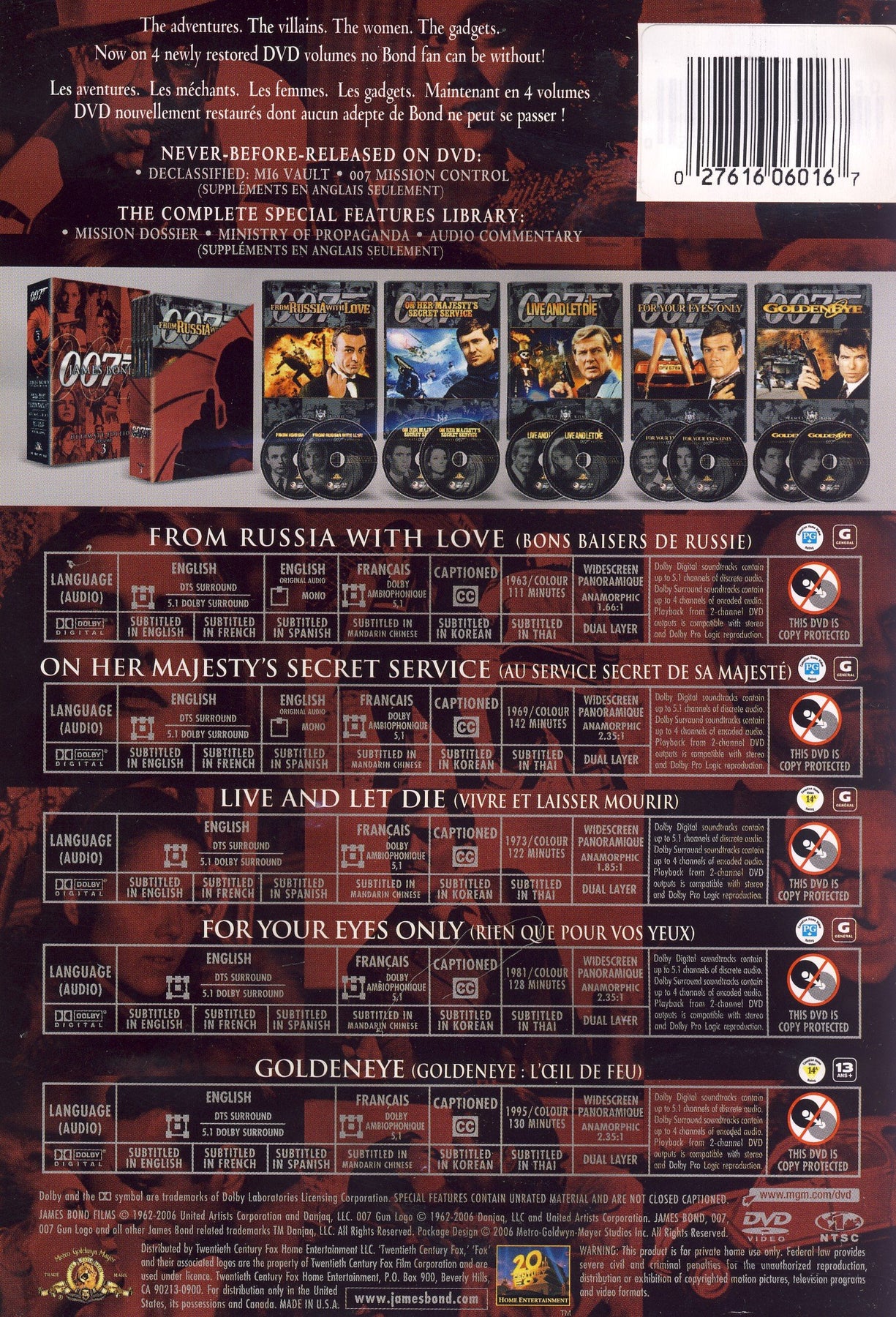 Details: Description *From Russia With Love Disc #1: -Movie with DTS 5.1 Surround and original mono/stereo -Language selections -Audio commentary by director Terence Young and cast and crew Disc #2: -DECLASSIFIED: MI6 VAULT Ian Fleming: The CBC Interview -Ian Fleming & Raymond Chandler -Ian Fleming on Desert Island Discs -Animated Storyboard Sequence -007 MISSION CONTROL Interactive Guide Into the World of From Russia With Love -THE COMPLETE SPECIAL FEATURES LIBRARY: MISSION DOSSIER -Inside From Russia With Love -Harry Saltzman: Showman -MINISTRY OF PROPAGANDA Original Trailers, TV Spots, Photo Gallery & Radio Communications *For Your Eyes Only Disc #1: -Movie with DTS 5.1 Surround and original mono/stereo -Newly Recorded Audio Commentary Featuring Sir Roger Moore -Language selections -Audio Commentary Featuring John Glen and Actors -Audio Commentary Featuring Michael G Wilson and Crew Disc #2 -Newly Recorded Audio Commentary Featuring Sir Roger Moore -DECLASSIFIED: MI6 VAULT Deleted Scenes & Expanded Angles -Bond in Greece Bond in Cortina -Neptune's Journey -007 MISSION CONTROL Interactive Guide Into the World of For Your Eyes Only -THE COMPLETE SPECIAL FEATURES LIBRARY: MISSION DOSSIER -Inside For Your Eyes Only -Animated Storyboard Sequences -Sheena Easton 'For Your Eyes Only' Music Video -MINISTRY OF PROPAGANDA Original Trailers, TV Spots, Photo Gallery & Radio Communications *On Her Majesty's Secret Service Disc #1: -Movie with DTS 5.1 Surround and original mono/stereo -Language selections -Audio Commentary Featuring Director Peter Hunt and Members of the Cast and Crew Disc #2: -DECLASSIFIED: MI6 VAULT Casting On Her Majesty's Secret Service -Press Day in Portugal -George Lazenby: In His Own Words -Shot on Ice - Original 1969 Ford Promo -Film Swiss Movement - Original 1969 Featurette 007 -007 MISSION CONTROL Interactive Guide Into the World of On Her Majesty's Secret Service -THE COMPLETE SPECIAL FEATURES LIBRARY: MISSION DOSSIER -Inside On Her Majesty's Secret Service -Inside Q's Lab -Above It All - Original 1969 Featurette *Live And Let Die Disc #1: -Movie with DTS 5.1 Surround and original mono/stereo -Newly Recorded Audio Commentary Featuring Sir Roger Moore -Language selections -Audio commentary by director Guy Hamilton and Tom Mankiewicz and cast and crew Disc #2: -DECLASSIFIED: MI6 VAULT Bond 1973: The Lost Documentary -Roger Moore as James Bond, Circa 1964 -Live and Let Die Conceptual Art -007 MISSION CONTROL Interactive Guide Into the World of Live and Let Die -THE COMPLETE SPECIAL FEATURES LIBRARY: MISSION DOSSIER -Inside Live and Let Die -On Set With Roger Moore *GoldenEye Disc #1: -Movie with DTS 5.1 Surround and original stereo -Language selections -Audio Commentary Featuring Martin Campbell and Michael G. Wilson Disc #2: -DECLASSIFIED: MI6 VAULT Deleted Scenes With Introductions by -Director Martin Campbell -Directing Bond: The Martin Chronicles -Building a Better Bond: Pre-Production Featurette -The Return of Bond - The Start of Production Press Event -Driven to Bond: Remy Julienne -Anatomy of a Stunt: Tank Versus Perrier -Making it in Small Pictures: Derek Meddings -On Location With Peter Lamont -GoldenEye: The Secret Files -Pre-Title Storyboard Sequence With Director Martin Campbell -007 MISSION CONTROL Interactive Guide Into the World of GoldenEye -THE COMPLETE SPECIAL FEATURES LIBRARY: MISSION DOSSIER -The World of 007 - Original 1995 Television Special Hosted by Elizabeth Hurley -The GoldenEye Video Journal Promotional Featurette -Tina Turner 'GoldenEye' Music Video -MINISTRY OF PROPAGANDA Original Trailers, TV Spots, Photo Gallery & Radio Communications