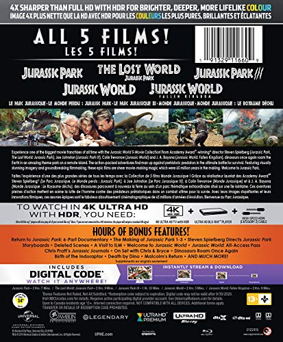 Details: Experience one of the biggest movie franchises of all time with the Jurassic World 5-Movie Collection! From Academy Award®-winning director Steven Spielberg (Jurassic Park, The Lost World: Jurassic Park), Joe Johnston (Jurassic Park III), Colin Trevorrow (Jurassic World) and J. A. Bayona (Jurassic World: Fallen Kingdom), dinosaurs once again roam the Earth in an amazing theme park on a remote island. The action-packed adventures find man up against prehistoric predators in the ultimate battle for survival. Featuring visually stunning imagery and groundbreaking filmmaking, these epic films are sheer movie-making magic which were 65 million years in the making. Welcome to Jurassic Park. Bonus Content: Disc 1 - Jurassic Park: Includes 4K UHD, Blu-ray and a digital copy of Jurassic Park (Subject to expiration. Go to NBCUCodes.com for details.) Features High Dynamic Range (HDR) for Brighter, Deeper, More Lifelike Color Disc 2 - Jurassic Park: Return to Jurassic Park: Dawn of a New Era Return to Jurassic Park: Making Prehistory Return to Jurassic Park: The Next Step in Evolution The Making of Jurassic Park Original Featurette on the Making of the Film Steven Spielberg Directs Jurassic Park Hurricane in Kauai Featurette Early Pre-Production Meetings Location Scouting Phil Tippett Animatics: Raptors in the Kitchen Animatics: T-Rex Attack ILM And Jurassic Park: Before and After the Visual Effects Foley Artists Storyboards Production Archives: Photographs, Design Sketches and Conceptual Paintings Jurassic Park: Making the Game Trailer Disc 3 - The Lost World: Jurassic Park: Includes 4K UHD, Blu-ray and a digital copy of The Lost World: Jurassic Park (Subject to expiration. Go to NBCUCodes.com for details.) Features High Dynamic Range (HDR) for Brighter, Deeper, More Lifelike Color Disc 4 - The Lost World: Jurassic Park: Return to Jurassic Park: Finding The Lost World Return to Jurassic Park: Something Survived Deleted Scenes The Making of The Lost World Original Featurette on the Making of the Film The Jurassic Park Phenomenon: A Discussion with Author Michael Crichton The Compie Dance Number: Thank You Steven Spielberg From ILM ILM & The Lost World: Before & After the Visual Effects Production Archives: Production Photographs, Illustrations and Conceptual Drawings, Models, The World of Jurassic Park, The Magic of ILM, Posters and Toys Storyboards Trailer Disc 5 - Jurassic Park III: Includes 4K UHD, Blu-ray and a digital copy of Jurassic Park III (Subject to expiration. Go to NBCUCodes.com for details.) Features High Dynamic Range (HDR) for Brighter, Deeper, More Lifelike Color Feature Commentary with Special Effects Team Disc 6 - Jurassic Park III: Return To Jurassic Park: The Third Adventure The Making of Jurassic Park III The Dinosaurs of Jurassic Park III The Special Effects of Jurassic Park III The Industrial Light & Magic Press Reel The Sounds of Jurassic Park III The Art of Jurassic Park III Montana: Finding New Dinosaurs Tour of Stan Winston Studio Spinosaurus Attacks the Plane Raptors Attack Udesky The Lake A Visit to ILM Dinosaur Turntables Storyboards to Final Feature Comparison Production Photographs Feature Commentary with Special Effects Team Trailer Disc 7 - Jurassic World: Includes 4K UHD, Blu-ray and a digital copy of Jurassic World (Subject to expiration. Go to NBCUCodes.com for details.) Features High Dynamic Range (HDR) for Brighter, Deeper, More Lifelike Color Disc 8 - Jurassic World: Deleted Scenes Chris & Colin Take on the World Welcome to Jurassic World Dinosaurs Roam Once Again Jurassic World: All-Access Pass Innovation Center Tour with Chris Pratt Jurassic's Closest Shaves – Presented by Barbasol® Disc 9 - Jurassic World: Fallen Kingdom: Includes 4K UHD, Blu-ray and a digital copy of Jurassic World: Fallen Kingdom (Subject to expiration. Go to NBCUCodes.com for details.) Features High Dynamic Range (HDR) for Brighter, Deeper, More Lifelike Color On Set with Chris & Bryce The Kingdom Evolves Return to Hawaii Island Action Aboard the Arcadia Birth of the Indoraptor Start the Bidding! Death by Dino Monster in a Mansion Rooftop Showdown Malcolm's Return VFX Evolved Fallen Kingdom: The Conversation A Song for the Kingdom Chris Pratt's Jurassic Journals Jurassic Then and Now - Presented by Barbasol® Disc 10 - Jurassic World: Fallen Kingdom: On Set with Chris & Bryce The Kingdom Evolves Return to Hawaii Island Action Aboard the Arcadia Birth of the Indoraptor Start the Bidding! Death by Dino Monster in a Mansion Rooftop Showdown Malcolm's Return VFX Evolved Fallen Kingdom: The Conversation A Song for the Kingdom Chris Pratt's Jurassic Journals Jurassic Then and Now - Presented by Barbasol® ]]>
