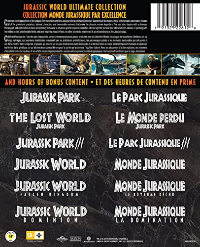 Details: Celebrate the legacy of one of the biggest film franchises with the Jurassic World Ultimate Collection. Spanning all six movies, these unforgettable adventures feature all of the prehistoric predators, beloved characters and memorable moments that make the Jurassic movies legendary. The epic story begins with a dinosaur theme park and culminates in chaos as humanity's impulse to advance genetic science unleashes a fierce fight for survival that alters nature's balance. Exploding with incredible action, unbelievable thrills and awe-inspiring visual effects, no other cinematic experience is as extraordinary as the Jurassic saga. Bonus Content: Disc 1 - Jurassic Park: Includes a digital copy of Jurassic Park (Subject to expiration. Go to NBCUCodes.com for details.) Return to Jurassic Park: Dawn of a New Era Return to Jurassic Park: Making Prehistory Return to Jurassic Park: The Next Step in Evolution The Making of Jurassic Park Original Featurette on the Making of the Film Steven Spielberg Directs Jurassic Park Hurricane in Kauai Featurette Early Pre-Production Meetings Location Scouting Phil Tippett Animatics: Raptors in the Kitchen Animatics: T-Rex Attack ILM And Jurassic Park: Before and After the Visual Effects Foley Artists Storyboards Production Archives: Photographs, Design Sketches and Conceptual Paintings Jurassic Park: Making the Game Theatrical Disc 2 - Jurassic Park: Theatrical Trailer Disc 3 - The Lost World: Jurassic Park: Includes a digital copy of The Lost World: Jurassic Park (Subject to expiration. Go to NBCUCodes.com for details.) Return to Jurassic Park: Finding The Lost World Return to Jurassic Park: Something Survived Deleted Scenes The Making of The Lost World Original Featurette on the Making of the Film The Jurassic Park Phenomenon: A Discussion with Author Michael Crichton The Compie Dance Number: Thank You Steven Spielberg From ILM ILM & The Lost World: Before & After the Visual Effects Production Archives: Production Photographs, Illustrations and Conceptual Drawings, Models, The World of Jurassic Park, The Magic of ILM, Posters and Toys Storyboards Theatrical Trailer Disc 4 - The Lost World: Jurassic Park: Deleted Scenes Theatrical Trailer Disc 5 - Jurassic Park III: Includes a digital copy of Jurassic Park III (Subject to expiration. Go to NBCUCodes.com for details.) Return To Jurassic Park: The Third Adventure The Making of Jurassic Park III The Dinosaurs of Jurassic Park III The Special Effects of Jurassic Park III The Industrial Light & Magic Press Reel The Sounds of Jurassic Park III The Art of Jurassic Park III Montana: Finding New Dinosaurs Tour of Stan Winston Studio Spinosaurus Attacks The Plane Raptors Attack Udesky The Lake A Visit to ILM Dinosaur Turntables Storyboards to Final Feature Comparison Production Photographs Feature Commentary with Special Effects Team Theatrical Trailer Disc 6 - Jurassic Park III: The Making of Jurassic Park III Feature Commentary with Special Effects Team The New Dinosaurs of Jurassic Park III Tour of Sam Winston Studio A Visit to ILM Dinosuar Turntables Behind-the-Scenes Storyboards to Final Feature Comparison Jurassic Park III Archives Theatrical Trailer Montana: Finding New Dinosaurs Production Notes JP Institute Disc 7 - Jurassic World: Includes a digital copy of Jurassic World (Digital Copy redemption code subject to expiration. See product insert for details.) Deleted Scenes Chris & Colin Take on the World Welcome to Jurassic World Dinosaurs Roam Once Again Jurassic World: All-Access Pass Innovation Center Tour with Chris Pratt Jurassic's Closest Shaves Presented by Barbasol® Disc 8 - Jurassic World: Deleted Scenes Chris & Colin Take on the World Dinosaurs Roam Once Again Disc 9 - Jurassic Wo]]>