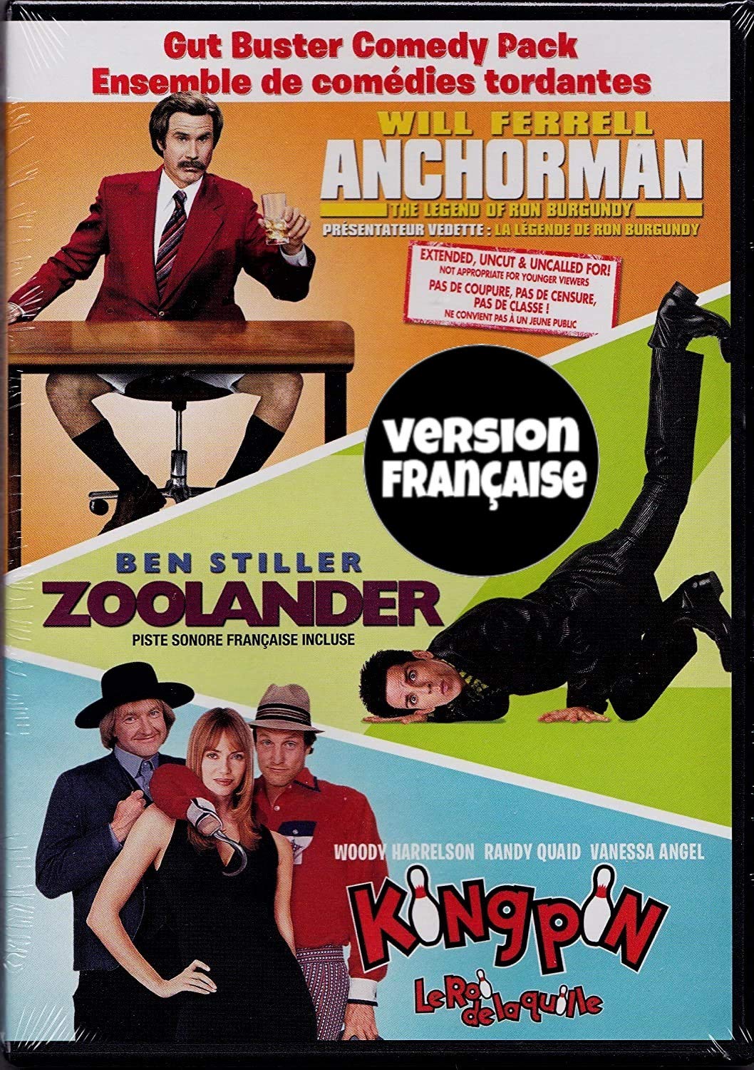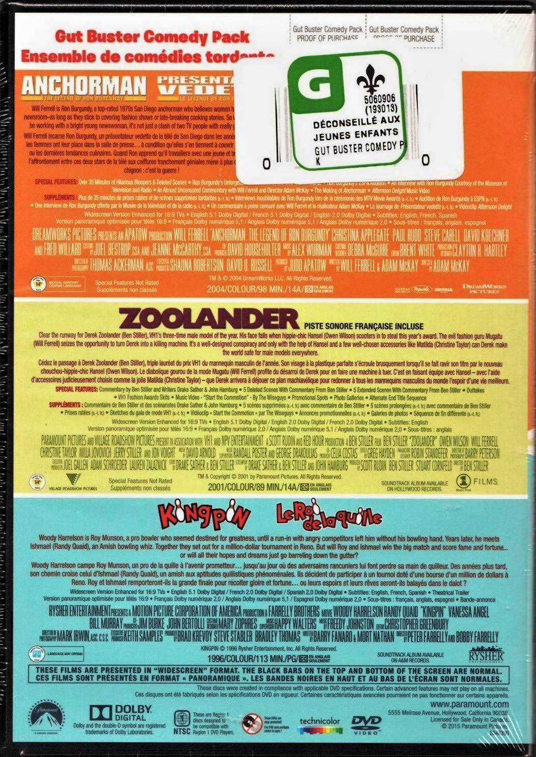 Details: COVER BILINGUE - PISTE AUDIO EN FRANCAIS Doublé au Québec ( ENGLISH AND FRENCH LANGUAGE ) Ensemble De Comédies Tordantes : Kingpin ou Le Roi de la Quille au Québec est un film américain produit en 1996 par les Frères Farrelly. Zoolander est un film australo-germano-américain réalisé par Ben Stiller, sorti en 2001.Présentateur vedette : La Légende de Ron Burgundy (Anchorman: The Legend of Ron Burgundy), est un film américain réalisé par Adam McKay et sorti en salles en 2004.