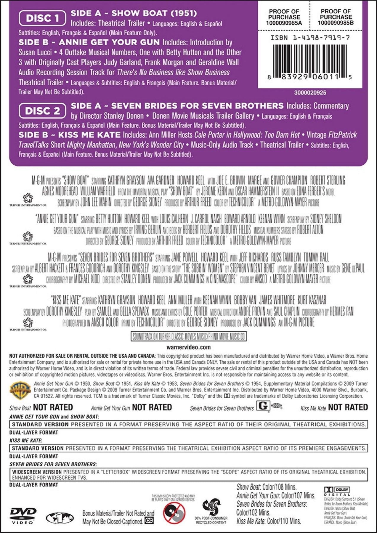 TCM Greatest Classic Films Collection: Broadway Musicals (Show Boat / Annie Get Your Gun / Kiss Me Kate / Seven Brides for Seven Brothers) - DVD (Used)