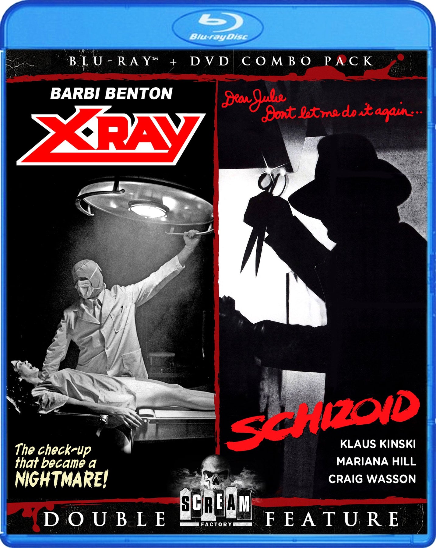 Details: X-ray: while receiving a routine check-up, a beautiful woman is stalked by a maniac out to avenge a childhood valentine's day humiliation. Schizoid: a black-gloved killer , armed with a pair of scissors, stalks members of a group therapy session. //