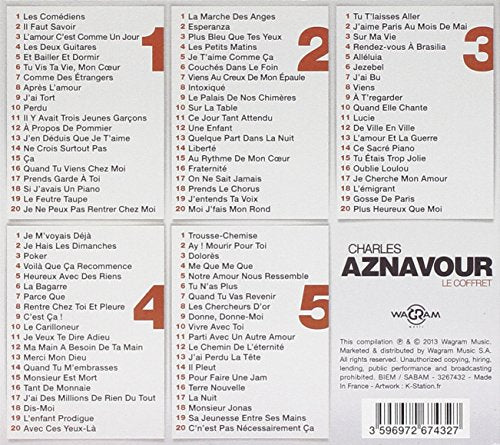 Details: CD 1: 01. Les comédiens 02. Il faut savoir 03. L'amour c'est comme un jour 04. Les deux guitares 05. Et bailler et dormir 06. Tu vis ta vie, mon coeur 07. Comme des étrangers 08. Apres l'amour 09. J'ai tort 10. Perdu 11. Il y avait trois jeunes garçons 12. A propos de pommier 13. J'en déduis que je t'aime 14. Ne crois surtout pas 15. Ça 16. Quand tu viens chez moi 17. Prends garde a toi 18. Si j’avais un piano 19. Le feutre taupe 20. Je ne peux pas rentrer chez moi CD 2: 01. La marche des anges 02. Esperanza 03. Plus bleu que tes yeux 04. Les petits matins 05. Je t'aime comme ça 06. Couches dans le foin 07. Viens au creux de mon épaule 08. Intoxique 09. Le palais de nos chimères 10. Sur la table 11. Ce jour tant attendu 12. Une enfant 13. Quelque part dans la nuit 14. Liberté 15. Au rythme de mon coeur 16. Fraternité 17. On ne sait jamais 18. Prends le chorus 19. J'entends ta voix 20. Moi j fais mon rond CD 3: 01. Tu te laisses aller 02. J'aime paris au mois de mai 03. Sur ma vie 04. Rendez-vous à brasilia 05. Alléluia 06. Jezebel 07. J'ai bu 08. Viens 09. A t'regarder 10. Quand elle chante 11. Lucie 12. De ville en ville 13. L'amour et la guerre 14. Ce sacre piano 15. Tu étais trop jolie 16. Oublie Loulou 17. Je cherche mon amour 18. L'emigrant 19. Gosse de paris 20. Plus heureux que moi CD 4: 01. Je m'voyais déjà 02. Je hais les dimanches 03. Poker 04. Voila que ca recommence 05. Heureux avec des riens 06. La bagarre 07. Parce que 08. Rentre chez toi et pleure 09. C'est ca ! 10. Le carilloneur 11. Je veux te dire adieu 12. Ma main a besoin de ta main 13. Merci mon dieu 14. Quand tu m'embrasses 15. Monsieur est mort 16. Tant de monnaie 17. J'ai des millions de rien du tout 18. Dis-moi 19. L'enfant prodigue 20. Avec ces yeux-la CD 5: 01. Trousse chemise 02. Ay ! Mourir pour toi 03. Dolores 04. Me que me que 05. Notre amour nous ressemble 06. Tu n'as plus 07. Quand tu vas revenir 08. Les chercheurs d or 09. Donne,donne-moi 10. Vivre avec toi 11. Parti avec un autre amour 12. Le chemin de l'eternite 13. J'ai perdu la tete 14. Il pleut 15. Pour faire une jam 16. Terre nouvelle 17. La nuit 18. Monsieur jonas 19. Sa jeunesse entre ses mains 20. C'n'est pas forcément ca