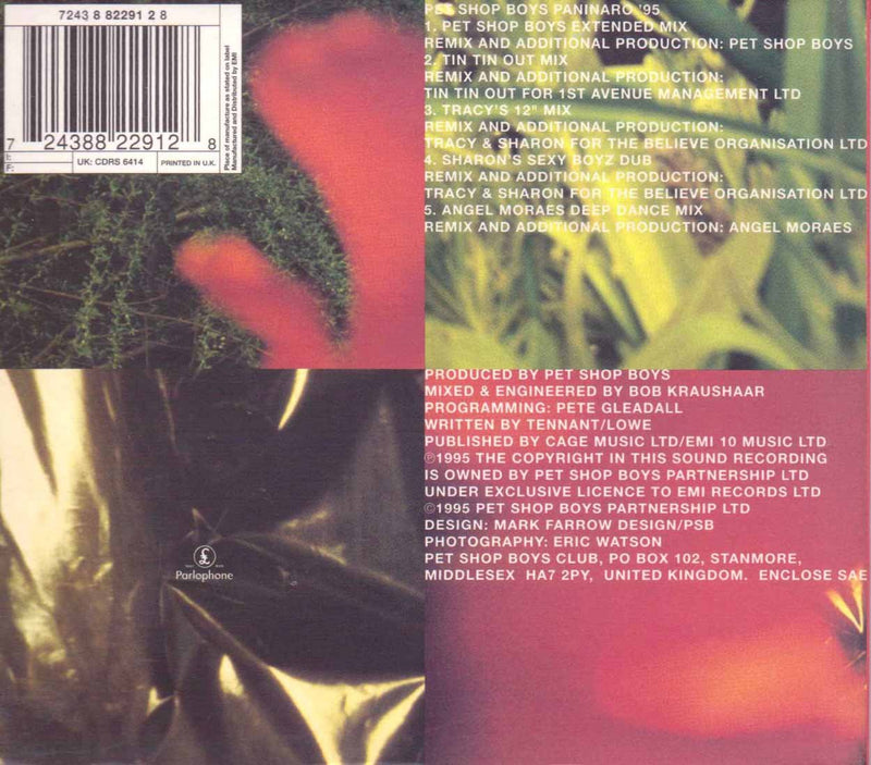 Details: PET SHOP BOYS Paninaro 95 (1995 UK Part One 5-track CD single including their Extended Mix along with remixes from Tin Tin Out Tracy & Sharon and Angel Moraes red digipak picture sleeve CDRS6414)