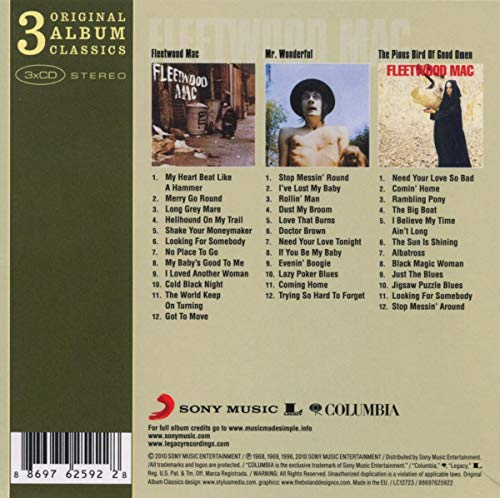 Details: 2010 three CD set containing a trio of original '60s albums from the veteran Rock band: Mr. Wonderful (1968), Fleetwood Mac (1968) and Pious Bird of Good Omen (1969). Fleetwood Mac's later years as a hit-making Top 40 U.S.-based Pop machine have eclipsed their humble beginnings as a Blues outfit in the UK, but these early recordings have retained their power over the years. Formed by guitarist Peter Green, the Mac were one of the most popular bands to emerge from the great British Blues boom of the '60s. This trio of albums may not have had the commercial success that the '70s/'80s version of the band had, but they were a lot more influential. Epic.