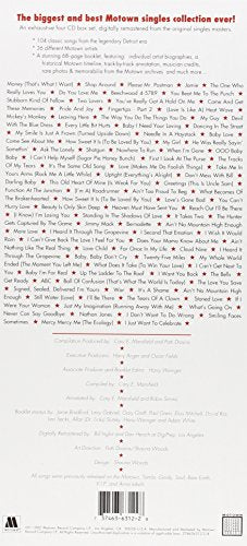 Details: Amazon.ca Motown did so many things well in the '60s and early '70s that this overview of the label's smashes (and some lesser-known classics) practically demands four CDs. It gets them, too, filling them with single mixes of more than 100 tracks. That the running order begins with Barrett Strong's statement of purpose "Money (That's What I Want)" and ends with Marvin Gaye's statement of concern "Mercy Mercy Me (The Ecology)" says a lot about how far the company moved in its golden decade--but no more so than what the same two cuts' differences in sound get across. The company was able to blend the smooth and the harsh in ways that few other pop entities have ever mastered, thereby getting over not only to the feet and the wallet, but to the heart. --Rickey Wright Product Description Nearly every one of these 104 tracks is a hit, and we mean a big hit, from 36 different, very famous artists the Supremes, Temptations, Stevie Wonder, Smokey Robinson, Martha Reeves & the Vandellas et cetera, et cetera. With a 68 page booklet and songs like just for example; Stop! In the Name of Love. A must.