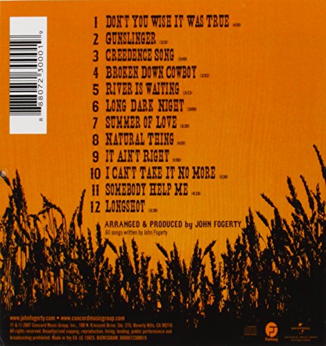 Details: Amazon.ca The self-referential title of Fogerty's first album in three years is no mere play on words; this is as close as he's gotten in a long while to duplicating the loose swamp blues, country, folk, soul and rock that he so memorably created a template for in Creedence Clearwater Revival. Thankfully the advertisement for downloaded ringtones in the disc's booklet is the only contemporary influence creeping into this stripped-down set of rootsy rockers and ballads. Fogerty's voice sounds great throughout; passionate, more committed and comfortable with these songs than he has seemed in years. His material has often leaned towards politics, especially as it concerns the working class, but seldom as directly as on the gutsy choogle of "Long Dark Night" and the rollicking "I Can’t Take it No More." He seems like a cranky dad on "It Ain't Right," railing about spoiled pop tarts in the spotlight, and "Summer of Love"'s look back at the titular time in the late '60s falls on the schlock side. But Fogerty charges into "Longshot" like the angry young man of "Fortunate Son," singing "I ain't got no 'ristocrats a-hangin' in my tree" with an assurance and intensity that reaches through the speakers and grabs the listener. Just like in the old days. --Hal Horowitz Product description 1. Don't You Wish It Was True 2. Gunslinger 3. Creedence Song 4. Broken Down Cowboy 5. River Is Waiting 6. Long Dark Night 7. Summer Of Love 8. Natural Thing 9. It Ain't Right 10. I Can't Take It No More 11. Somebody Help Me 12. Longshot