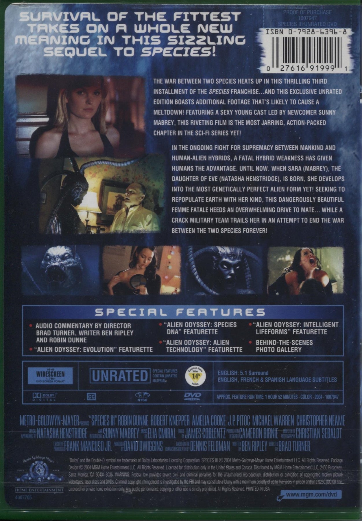 Details: Mankind's number is up in this thrilling third installment of the Species franchise! Featuring eye-popping special effects, knuckle-whitening suspense and the dazzling performance of sexy newcomer Sunny Mabrey, Species III is the most jarring, action-packed chapter in the sci-fi series yet! In the ongoing fight for supremacy between mankind and human-alien hybrids, a fatal hybrid weakness has given humans the advantage. Until now. When Sara (Mabrey), the daughter of Eve (Natasha Henstridge), is born, she develops into the most genetically perfect alien form yet! Seeking to repopulate the earth with her kind, this dangerously beautiful femme fatale heeds an overwhelming drive to mate while a crack military team trails her in an attempt to end the war between the two species forever!