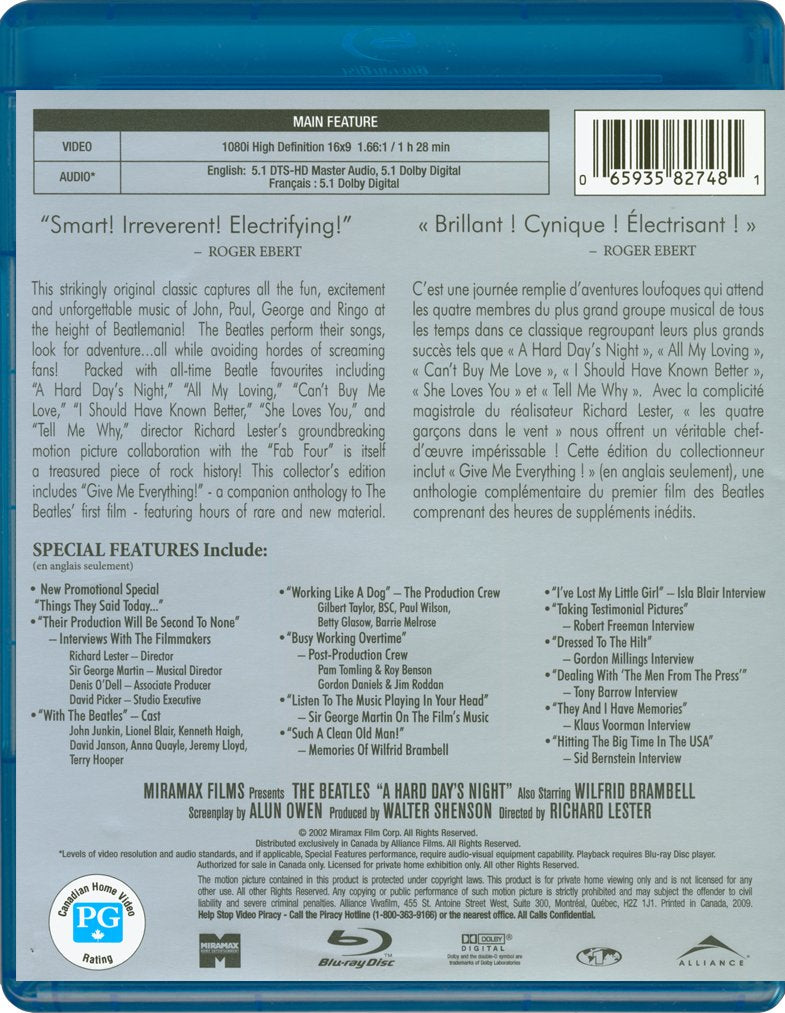 Details: Amazon.ca The Fab Four from Liverpool--John Lennon, Paul McCartney, George Harrison, and Ringo Starr--in their first movie. Nobody expected A Hard Day's Night to be much more than a quick exploitation of a passing musical fad, but when the film opened it immediately seduced the world--even the stuffiest critics fell over themselves in praise (highbrow Dwight Macdonald called it "not only a gay, spontaneous, inventive comedy but it is also as good cinema as I have seen for a long time"). Wisely, screenwriter Alun Owen based his script on the Beatles' actual celebrity at the time, catching them in the delirious early rush of Beatlemania: eluding rampaging fans, killing time on trains and in hotels, appearing on a TV broadcast. American director Richard Lester, influenced by the freestyle French New Wave and British Goon Show humor, whips up a delightfully upbeat circus of perpetual motion. From the opening scene of the mop tops rushing through a train station mobbed by fans, the movie rarely stops for air. Some of the songs are straightforwardly presented, but others ("Can't Buy Me Love," set to the foursome gamboling around an empty field) soar with ingenuity. Above all, the Beatles express their irresistible personalities: droll, deadpan, infectiously cheeky. Better examples of pure cinematic joy are few and far between. --Robert Horton Product description The Beatles: A Hard Day's Night (Collector's Edition) [Blu-ray]