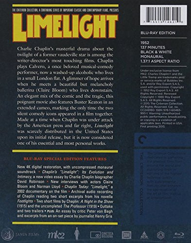 Details: Charlie Chaplin's masterful drama about the twilight of a former vaudeville star is among the writer-director's most touching films. Chaplin plays Calvero, a once beloved musical-comedy performer, now a washed-up alcoholic who lives in a small London flat. A glimmer of hope arrives when he meets a beautiful but melancholy ballerina (Richard III's Claire Bloom) who lives downstairs. An elegant mix of the comic and the tragic, this poignant film also features Buster Keaton (The General) in an extended cameo, marking the only time the two silent comedy icons appeared together on-screen. Made at a time when Chaplin was under attack by the American press and far right, Limelight was barely distributed in the United States upon its initial release, but it is now considered one of his essential and most personal works.