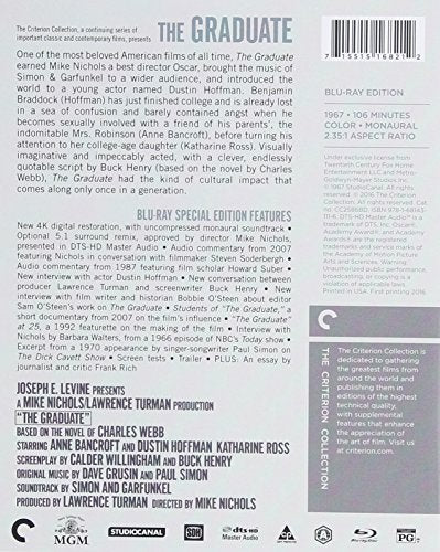 Details: One of the most beloved American films of all time, The Graduate earned Mike Nichols a best director Oscar, brought the music of Simon & Garfunkel to a wider audience, and introduced the world to a young actor named Dustin Hoffman. Benjamin Braddock (Hoffman) has just finished college and is already lost in a sea of confusion and barely contained angst when he becomes sexually involved with the middle-aged mother (Anne Bancroft) of the young woman he s dating (Katharine Ross). Visually imaginative and impeccably acted, with a clever, endlessly quotable script by Buck Henry (based on the novel by Charles Webb), The Graduate had the kind of cultural impact that comes along only once in a generation.brbrBLU-RAY SPECIAL EDITION FEATURESbr- New 4K digital restoration, with uncompressed monaural soundtrackbr- Optional 5.1 surround remix, approved by director Mike Nichols, presented in DTS-HD Master Audiobr- Audio commentary from 2007 featuring Nichols in conversation with filmmaker Steven Soderberghbr- Audio commentary from 1987 featuring film scholar Howard Suberbr- New interview with actor Dustin Hoffmanbr- New conversation between producer Lawrence Turman and actor-screenwriter Buck Henrybr- New interview with film writer and historian Bobbie O Steen about editor Sam O Steen s work on The Graduatebr- Students of The Graduate, a short documentary from 2007 on the film s influencebr- The Graduate at 25, a 1992 featurette on the making of the filmbr- Interview with Nichols by Barbara Walters, from a 1966 episode of NBC s Today showbr- Excerpt from a 1970 appearance by singer-songwriter Paul Simon on The Dick Cavett Showbr- Screen testsbr- Trailerbr- PLUS: An essay by journalist and critic Frank Rich