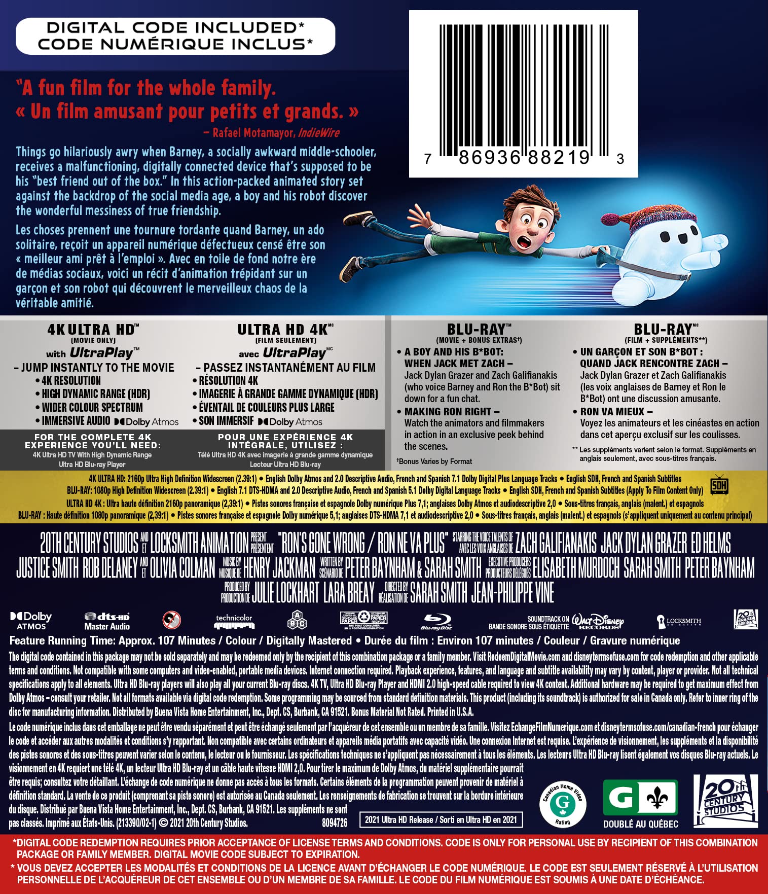 Details: Twentieth Century Studios and Locksmith Animation present "Ron's Gone Wrong," a heart-warming adventure about a young boy and a robot struggling to understand the meaning of true friendship in a world overrun with technology and social media. Directed by J.P. Vine, co-directed by Octavio Rodriquez and written by Peter Baynham and Sarah Smith, "Ron's Gone Wrong" features the voices of Zach Galifianakis, Jack Dylan Glazer, Olivia Colman, Ed Helms and Justice Smith. The film is produced by Julie Lockhart and Sarah Smith with Elisabeth Murdoch and Peter Baynham serving as executive producers.