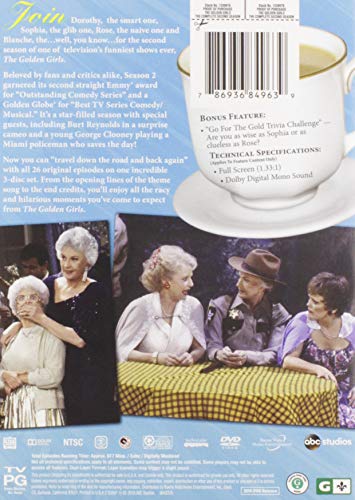 Details: Join Dorothy, the smart one, Sophia, the glib one, Rose, the naive one, and Blanche, the ... well, you know ... for the second season of one of television's funniest shows ever, THE GOLDEN GIRLS. Loved by fans and critics alike, Season 2 garnered its second straight Emmy award for "Outstanding Comedy Series" and a Golden Globe for "Best TV Series Comedy/Musical." It's a star-filled season with special guests, including Burt Reynolds in a surprise cameo and a young George Clooney playing a Miami policeman who saves the day! Now you can "travel down the road and back again" with all 26 original episodes on one incredible 3-disc set. From the opening lines of the theme song to the end credits, you'll enjoy all the racy and hilarious moments you've come to expect from THE GOLDEN GIRLS.