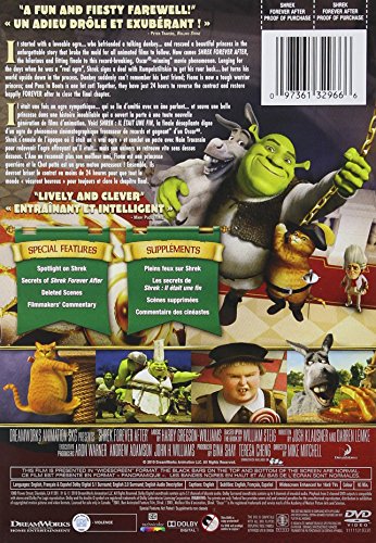 Details: One of the top 10 films of the year, SHREK FOREVER AFTER was heralded by audiences and critics around the world as the fitting finale to one of the most entertaining sagas in film history. It started with a loveable ogre who befriended a talking donkey and rescued a beautiful princess in the unforgettable story that broke the mold for all animated films to follow. Now comes SHREK FOREVER AFTER, the hilarious and fitting finale to the record-breaking, Oscar®-winning movie phenomenon. Longing for the days when he was a "real ogre, Shrek signs a deal with Rumpelstiltskin to get his roar back but turns his world upside down in the process. Donkey suddenly can't remember his best friend; Fiona is now a tough warrior princess ; and Puss in Boots is one fat cat! Together, they have just 24 hours to reverse the contract and restore happily FOREVER after to close the final chapter. Special Features Spotlight on Shrek Secrets of Shrek Forever After Deleted Scenes Filmmakers Commentary From Swamp to Stage: The Making of Shrek The Musical And more!