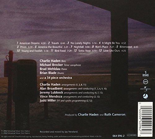 Details: Amazon.ca In recent years, Charlie Haden has steadily released duo albums (with Pat Metheny, Kenny Barron, and others) or worked with the sentimental-sounding Quartet West, which uses lush orchestration to supplement the quartet's sound. Haden has upgraded his quartet here on American Dreams, using the all-star cast of Michael Brecker, Brian Blade, and Brad Mehldau, but again brings in the orchestra for nearly every track. This "Quartet East" takes on a few Haden originals, as well as tunes by past collaborators Keith Jarrett and Ornette Coleman, and mixes them up with popular songs such as the theme from the film Tootsie and even the patriotic "America the Beautiful." Some of the non-jazz tunes are a bit sappy, but they do right by "America" thanks to an outstanding solo by Haden and just the right amount of orchestral support. American Dreams is probably too mainstream and glossy for fans of Haden's challenging early work, but there are a few nice moments amidst the glitter. --Tad Hendrickson Product Description Charlie Haden