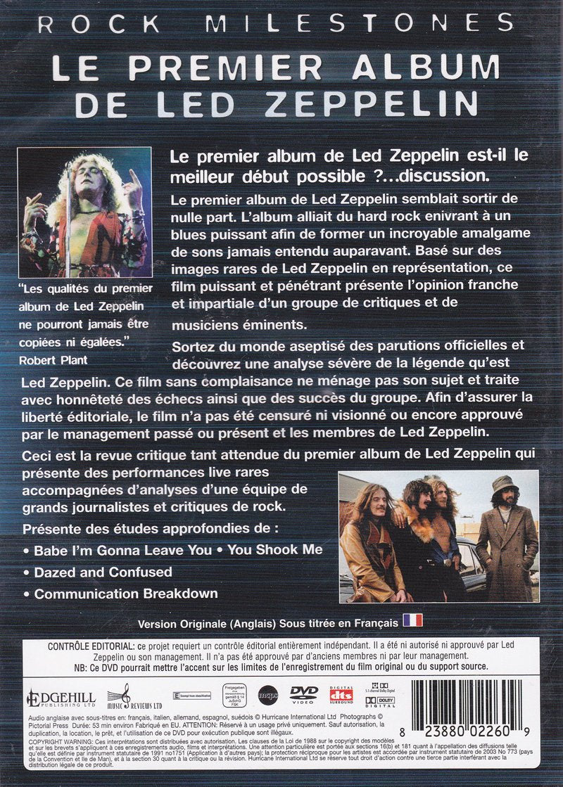 Details: LED ZEPPELIN Rock Milestones: Les Premier Album (2006 French edition DVD issued as part of Les Albums Essentiels De Tous Les Temps series containing an-depth look into the making of this legendary album featuring rare footage and exclusive interviews presented in a sealed Amray case with French text [complete with various language options!] Running time 53 minutes)