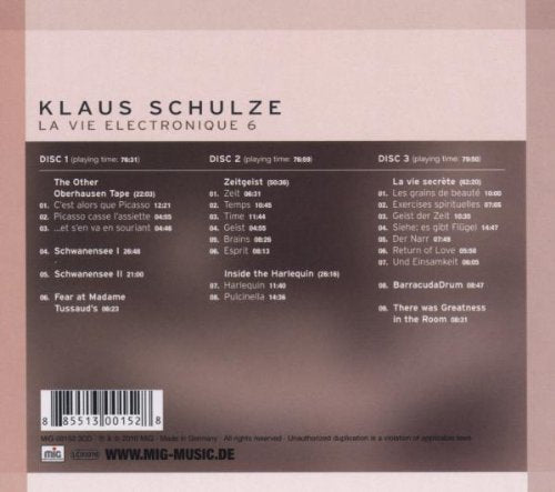Details: La Vie Electronique, Vol. 6 album for sale by Klaus Schulze was released Dec 07, 2010 on the MIG label. Liner Note Author: Lennart Koschella. La Vie Electronique, Vol. 6 songs Recording information: Brussels (1975); Frankfurt (1975); Hamb
