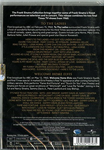 Details: The Frank Sinatra Collection brings together some of Frank Sinatra's finest performances on television and in concert. This release combines his two final Timex TV shows from 1960.brbrTO THE LADIES First broadcast by ABC on February 15, 1960, To The Ladies surrounded Frank Sinatra with a host of wonderful female performers for his third Timex sponsored television special. It's a mix of comedy, opera, dancing and great songs. Guests include Lena Horne, Mary Costa, Barbara Heller, Juliet Prowse and special guest star Eleanor Roosevelt. brbrWELCOME HOME ELVIS First broadcast by ABC on May 12, 1960, Welcome Home Elvis was Frank Sinatra's fourth and final Timex special. It marked Elvis Presley s first TV appearance after coming home from military service. Elvis performs Fame And Fortune and Stuck On You whilst Presley and Sinatra join forces on great renditions of Witchcraft and Love Me Tender. Joining in the fun are Nancy Sinatra, Sammy Davis Jr., Peter Lawford and Joey Bishop.brbrTRACKLISTING:brTO THE LADIES:br1) Here's To The Ladies (Frank Sinatra) 2) I've Got You Under My Skin (Frank Sinatra) 3) Ouvre Ton Coeur (Mary Costa) 4) By Strauss (Barbara Heller) 5) Ring The Bell (Lena Horne) 6) Come Cha Cha With Me (Juliet Prowse) 7) It's A Lonesome Old Town (Frank Sinatra) 8) But Beautiful (Lena Horne) 9) From This Moment On (Lena Horne) 10) Harold Arlen Medley: As Long As I LiveIt's Only A Paper MoonOne For My BabyAccentuate The PositiveStormy WeatherGet HappyBetween The Devil And The Deep Blue Sea (Frank SinatraLena Horne) 11) My Heart Stood Still (Frank Sinatra) 12) Yours Is My Heart Alone (Mary Costa) 13) Afraid Of Love (Barbara Heller) 14) My Heart Belongs To Daddy (Lena Horne) 15) My Funny Valentine (Juliet Prowse) 16) High Hopes (Eleanor Roosevelt) 17) Here's To The Ladies (Frank Sinatra)brbrWELCOME HOME ELVIS:br1) It's Nice To Go Trav'ling (Frank SinatraJoey BishopSammy Davis JrNancy Sinatra) 2) It's Nice To Go Trav'ling (Frank SinatraJoey BishopSammy Davis JrNancy SinatraElvis Presley) 3) Witchcraft (Frank Sinatra) 4) Come On Bess (Sammy Davis Jr) 5) Oriental Dance (Leona Irwin & The Tommy Hansen Dancers) 6) Gone With The Wind (Frank Sinatra) 7) Uh Oh! (Nutty Squirrels) 8) All The Way (Sammy Davis Jr) 9) Shall We Dance (Sammy Davis JrPeter Lawford) 10) Fame And Fortune (Elvis Presley) 11) Stuck On You (Elvis Presley) 12) Medley: WitchcraftLove Me Tender (Frank SinatraElvis Presley) 13) Medley: WitchcraftLove Me Tender - Reprise (Frank SinatraElvis Presley) 14) You Make Me Feel So Young (Frank SinatraNancy Sinatra) 15) Let's Dance (Nancy Sinatra)