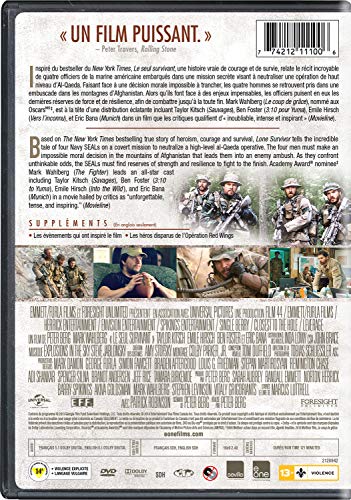 Details: Based on The New York Times bestselling true story of heroism, courage and survival, Lone Survivor tells the incredible tale of four Navy SEALs on a covert mission to neutralize a high-level al-Qaeda operative who are ambushed by the enemy in the mountains of Afghanistan. Faced with an impossible moral decision, the small band is isolated from help and surrounded by a much larger force of Taliban ready for war. As they confront unthinkable odds together, the four men find reserves of strength and resilience as they stay in the fight to the finish. Mark Wahlberg stars as Marcus Luttrell, the author of the first-person memoir ?Lone Survivor,? whose book has become a motivational resource for its lessons on how the power of the human spirit is tested when we are pushed beyond our mental and physical limits. Starring alongside Wahlberg as the other members of the SEAL team are Taylor Kitsch, Emile Hirsch and Ben Foster.