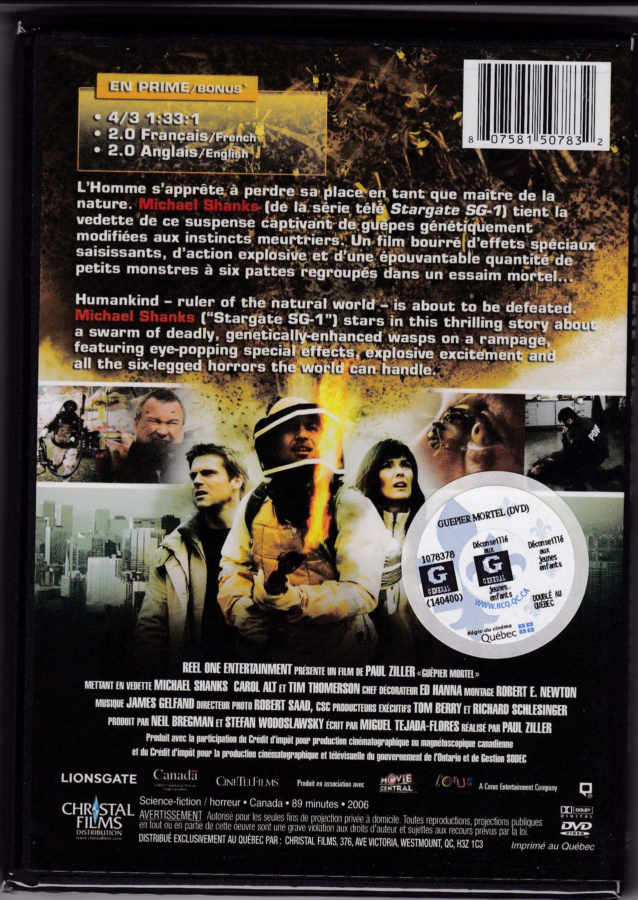Details: Humankind - ruler of the natural world - is about to be defeated. Michael Shanks ("Stargate SG-1") stars in this thrilling story about a swarm of deadly, genetically-enhanced wasps on a rampage, featuring eye-popping special effects, explosive excitement and all the six-legged horrors the world can handle. The DVD includes the original English version and a dubbed French version. L'homme s'apprête à perdre sa place en tant que maître de la nature. Michael Shanks (de la série télé Stargate SG-1) tient la vedette de ce suspense captivant de guêpes génétiquement modifiées aux instincts meurtriers. Un film bourré d'effets spéciaux saisissants, d'action explosive et d'une épouvantable quantité de petits monstres à six pattes regroupés dans un essaim mortel. Le DVD inclut la version originale anglaise et la version française.