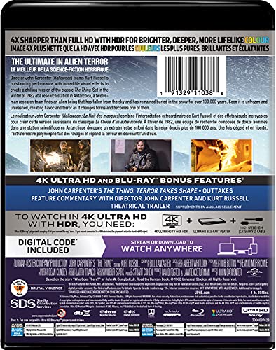 Details: Director John Carpenter (Halloween) teams Kurt Russell's outstanding performance with incredible visual effects to create a chilling version of the classic The Thing. Set in the winter of 1982 at a research station in Antarctica, a twelve-man research team finds an alien being that has fallen from the sky and has remained buried in the snow for over 100,000 years. Soon it is unfrozen and unleashed, creating havoc and terror as it changes forms and becomes one of them. Bonus Content: Features High Dynamic Range (HDR10) for Brighter, Deeper, More Lifelike Color John Carpenter's The Thing: Terror Takes Shape Outtakes Theatrical Trailer Feature Commentary with Director John Carpenter and Kurt Russell U-Control: Picture in Picture Feature Commentary with Kurt Russell and Director John Carpenter ]]>