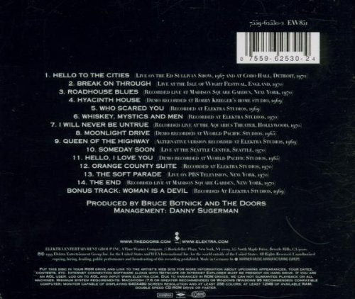 Details: Amazon.ca This collection, originally available only as a bonus disc in The Doors: The Complete Studio Recordings box set (fleshed out here with another outtake track, "Woman Is a Devil," from that set) is split just about evenly between a sometimes motley collection of outtakes and demos and a better slate of live material. It also argues that while most rock bands cut their teeth on blues and other roots music, then develop a distinct sound (or sell out to pop fashion trends), the Doors seemed to evolve ass-backwards, the band's, and particularly Jim Morrison's, college poet-nihilist pretensions slowly giving way to more blues-based influences. Indeed, after a few legendary years of late-1960s success and excess, Morrison had more than enough reasons to sing the blues. The studio leftovers here underscores why they're called "outtakes" (1965 demos of "Hello, I Love You" and "Moonlight Drive" are historically interesting, if a bit bubblegummy) though there are some highlights. "Whiskey, Mystics and Men" showcases another side of the band's tastefully odd Kurt Weill fetish; a '69 alternate of "Queen of the Highway" is almost lounge hipster chic; and "Orange County Suite" is a director from '70. Live cuts (all from '69 and '70) range from a baroque, affected PBS telecast of "The Soft Parade" to an apocalyptic, overwrought "The End." --Jerry McCulley Product descriptionBrand New