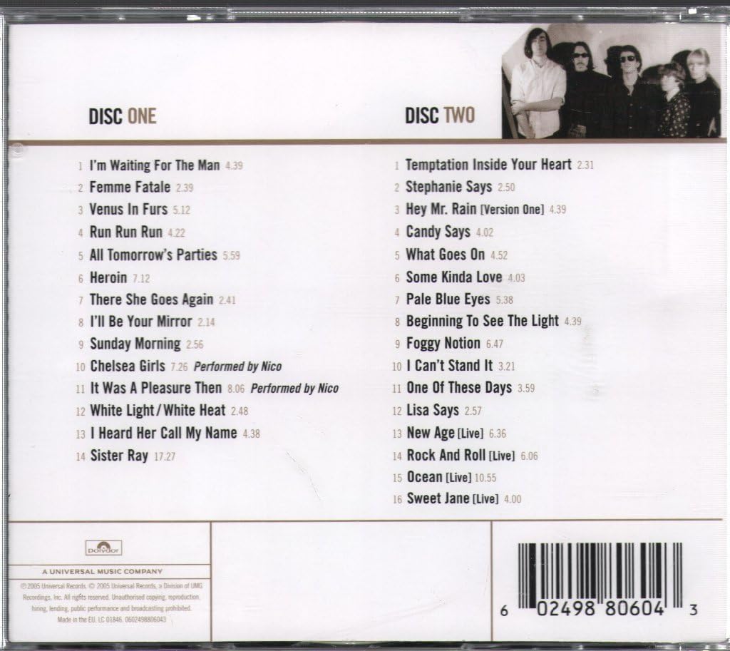 Details: The first double-disc Velvets collection, 30 tracks with a couple of solo Nico sides (Chelsea Girls and It Was a Pleasure Then) thrown in! Also includes Femme Fatale; Heroin; I'll Be Your Mirror; Sunday Morning; What Goes On; Pale Blue Eyes; Foggy Notion; live takes of New Age; Rock and Roll; Ocean, and Sweet Jane; Sister Ray, and more.