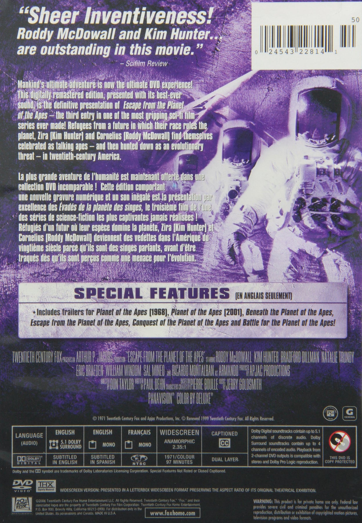 Details: Roddy McDowall and Kim Hunter reprise their roles from the original Planet of the Apes in this third chapter of the Apes saga. Two intelligent simians from the future, Cornelius (McDowall) and Zire (Hunter) travel to present-day Earth. They become instant sensations, wined and dined and treated like celebrities - until a high-level plot forces them to run for their lives!