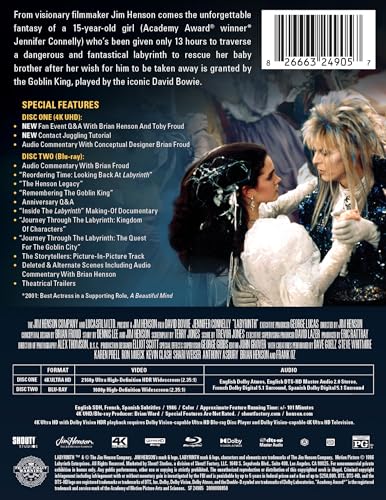 Details: Frustrated with babysitting on yet another weekend night, Sarah (Jennifer Connelly), a teenager with an active imagination, summons the Goblins to take her baby stepbrother away. When little Toby actually disappears, Sarah must follow him into a fantastical world to rescue him from the Goblin King (David Bowie). Directed by Jim Henson, who worked closely with acclaimed artist and Conceptual Designer, Brian Froud, and Executive Producer, George Lucas. With creatures brought to life by Jim Henson's Creature Shop, the film is a fantasy classic that is recognized as groundbreaking and wildly ahead of its time.
