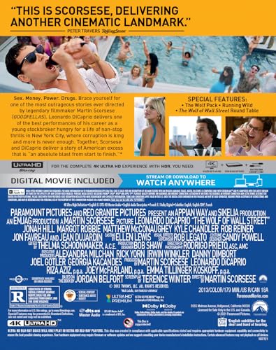 Details: Sex. Money. Power. Drugs. Brace yourself for an outrageous true story from legendary filmmaker Martin Scorsese that critics are calling “a masterpiece for a new generation.”* Leonardo DiCaprio delivers “the best performance of his career”** as a young stockbroker hungry for a life of non-stop thrills, where corruption was king and more was never enough. His rise to power earned him the title The Wolf of Wall Street. Together, Scorsese and DiCaprio deliver a story of American excess that is “an absolute blast from start to finish.” *** * James Verniere, Boston Herald, ** Claudia Puig, USA Today, *** Mick LaSalle, San Francisco Chronicle