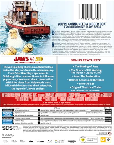 Details: Product Description Directed by Academy Award® winner Steven Spielberg, Jaws set the standard for edge-of-your-seat suspense, quickly becoming a cultural phenomenon and forever changing the movie industry. When the seaside community of Amity finds itself under attack by a dangerous great white shark, the town's chief of police (Roy Scheider), a young marine biologist (Richard Dreyfuss) and a grizzled shark hunter (Robert Shaw) embark on a desperate quest to destroy the beast before it strikes again. Featuring an unforgettable score that evokes pure terror, Jaws remains one of the most influential and gripping adventures in motion picture history. Bonus Content: Features Dolby Vision and HDR10+ for Brighter, Deeper, More Lifelike Color The Making of Jaws The Shark is Still Working: The Impact and Legacy of Jaws Jaws: The Restoration Deleted Scenes and Outtakes From the Set Theatrical Trailer The Shark Is Still Working: The Impact & Legacy of Jaws Storyboards Production Photos Marketing Jaws Jaws Phenomenon Jaws @ 50: The Definitive Inside Story ]]> Special Features Features Dolby Vision and HDR10+ for Brighter, Deeper, More Lifelike Color The Making of Jaws The Shark is Still Working: The Impact and Legacy of Jaws Jaws: The Restoration Deleted Scenes and Outtakes From the Set Theatrical Trailer The Shark Is Still Working: The Impact & Legacy of Jaws Storyboards Production Photos Marketing Jaws Jaws Phenomenon Jaws @ 50: The Definitive Inside Story ]]>